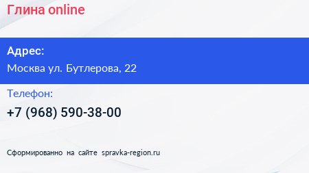 Глина.online по адресу Москва ул. Бутлерова, 22 в дальнейшем Организация, размещена в следующих категориях: