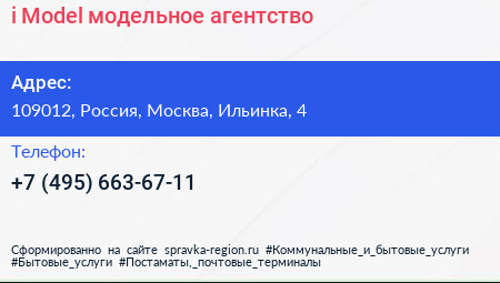 i Model, модельное агентство по адресу 109012, Россия, Москва, Ильинка, 4 в дальнейшем Организация, размещена в следующих категориях: