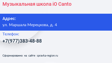 Музыкальная школа iO Canto по адресу ул. Маршала Мерецкова, д. 4 в дальнейшем Организация, размещена в следующих категориях: