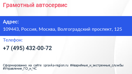 Грамотный, автосервис по адресу 109443, Россия, Москва, Волгоградский проспект, 125 в дальнейшем Организация, размещена в следующих категориях: