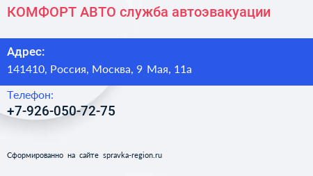 КОМФОРТ-АВТО, служба автоэвакуации по адресу 141410, Россия, Москва, 9 Мая, 11а в дальнейшем Организация, размещена в следующих категориях: