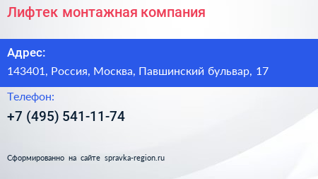 Лифтек, монтажная компания по адресу 143401, Россия, Москва, Павшинский бульвар, 17 в дальнейшем Организация, размещена в следующих категориях: