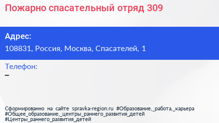 Пожарно-спасательный отряд №309 по адресу 108831, Россия, Москва, Спасателей, 1 в дальнейшем Организация, размещена в следующих категориях: