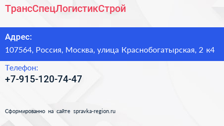 ТрансСпецЛогистикСтрой по адресу 107564, Россия, Москва, улица Краснобогатырская, 2 к4 в дальнейшем Организация, размещена в следующих категориях: