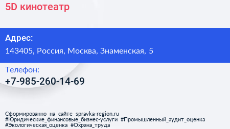 5D-кинотеатр по адресу 143405, Россия, Москва, Знаменская, 5 в дальнейшем Организация, размещена в следующих категориях: