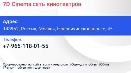 7D Cinema, сеть кинотеатров по адресу 143962, Россия, Москва, Носовихинское шоссе, 45 в дальнейшем Организация, размещена в следующих категориях: