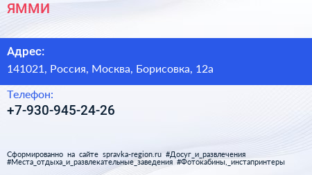 ЯММИ по адресу 141021, Россия, Москва, Борисовка, 12а в дальнейшем Организация, размещена в следующих категориях: