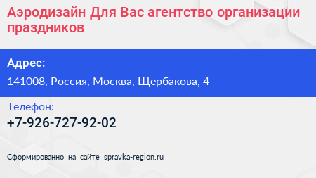 Аэродизайн Для Вас, агентство организации праздников по адресу 141008, Россия, Москва, Щербакова, 4 в дальнейшем Организация, размещена в следующих категориях: