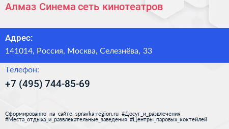 Алмаз Синема, сеть кинотеатров по адресу 141014, Россия, Москва, Селезнёва, 33 в дальнейшем Организация, размещена в следующих категориях: