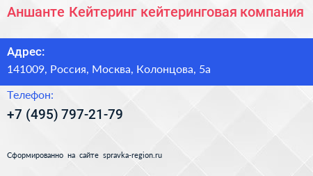 Аншанте-Кейтеринг, кейтеринговая компания по адресу 141009, Россия, Москва, Колонцова, 5а в дальнейшем Организация, размещена в следующих категориях: