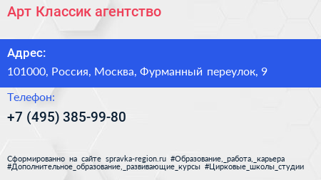 Арт Классик, агентство по адресу 101000, Россия, Москва, Фурманный переулок, 9 в дальнейшем Организация, размещена в следующих категориях: