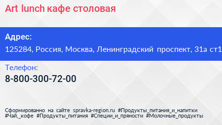 Art lunch, кафе-столовая по адресу 125284, Россия, Москва, Ленинградский проспект, 31а ст1 в дальнейшем Организация, размещена в следующих категориях: