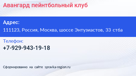 Авангард, пейнтбольный клуб по адресу 111123, Россия, Москва, шоссе Энтузиастов, 33 ст6а в дальнейшем Организация, размещена в следующих категориях: