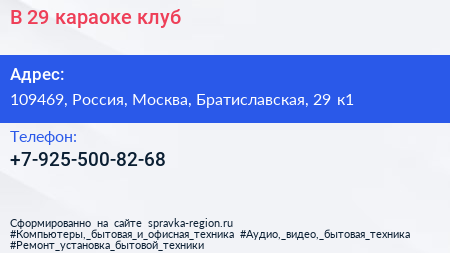 B-29, караоке-клуб по адресу 109469, Россия, Москва, Братиславская, 29 к1 в дальнейшем Организация, размещена в следующих категориях: