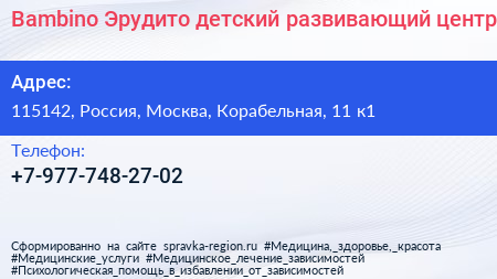Bambino Эрудито, детский развивающий центр по адресу 115142, Россия, Москва, Корабельная, 11 к1 в дальнейшем Организация, размещена в следующих категориях: