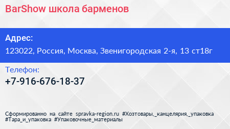BarShow, школа барменов по адресу 123022, Россия, Москва, Звенигородская 2-я, 13 ст18г в дальнейшем Организация, размещена в следующих категориях: