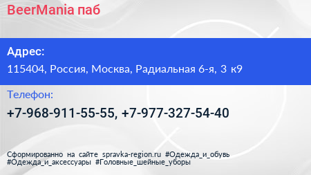 BeerMania, паб по адресу 115404, Россия, Москва, Радиальная 6-я, 3 к9 в дальнейшем Организация, размещена в следующих категориях: