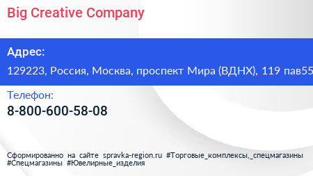 Big Creative Company по адресу 129223, Россия, Москва, проспект Мира (ВДНХ), 119 пав55 в дальнейшем Организация, размещена в следующих категориях: