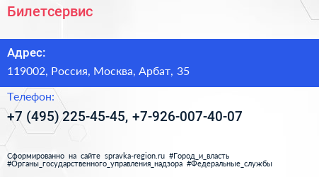 Билетсервис по адресу 119002, Россия, Москва, Арбат, 35 в дальнейшем Организация, размещена в следующих категориях: