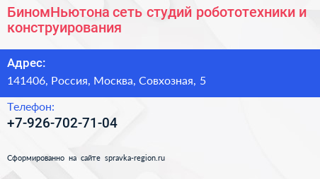 БиномНьютона, сеть студий робототехники и конструирования по адресу 141406, Россия, Москва, Совхозная, 5 в дальнейшем Организация, размещена в следующих категориях: