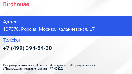 Birdhouse по адресу 107078, Россия, Москва, Каланчёвская, 17 в дальнейшем Организация, размещена в следующих категориях: