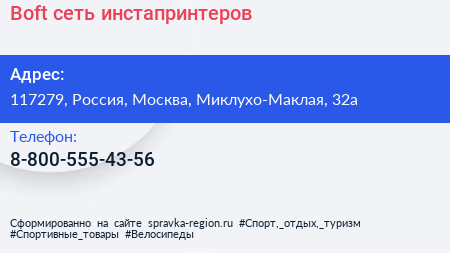 Boft, сеть инстапринтеров по адресу 117279, Россия, Москва, Миклухо-Маклая, 32а в дальнейшем Организация, размещена в следующих категориях: