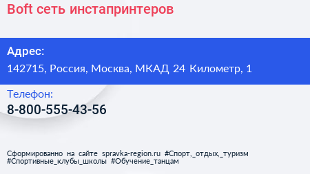 Boft, сеть инстапринтеров по адресу 142715, Россия, Москва, МКАД 24 Километр, 1 в дальнейшем Организация, размещена в следующих категориях: