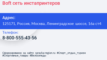 Boft, сеть инстапринтеров по адресу 125171, Россия, Москва, Ленинградское шоссе, 16а ст4 в дальнейшем Организация, размещена в следующих категориях: