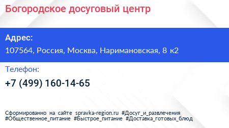 Богородское, досуговый центр по адресу 107564, Россия, Москва, Наримановская, 8 к2 в дальнейшем Организация, размещена в следующих категориях: