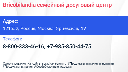 Bricobilandia, семейный досуговый центр по адресу 121552, Россия, Москва, Ярцевская, 19 в дальнейшем Организация, размещена в следующих категориях: