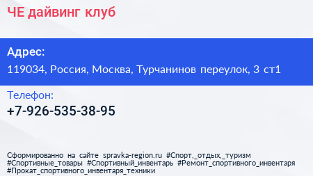 ЧЕ, дайвинг-клуб по адресу 119034, Россия, Москва, Турчанинов переулок, 3 ст1 в дальнейшем Организация, размещена в следующих категориях: