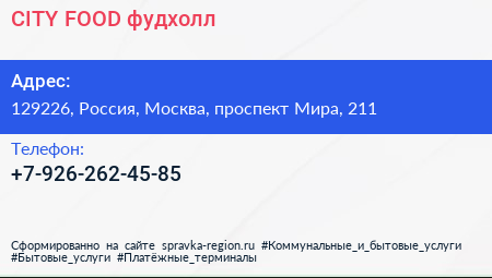CITY FOOD, фудхолл по адресу 129226, Россия, Москва, проспект Мира, 211 в дальнейшем Организация, размещена в следующих категориях: