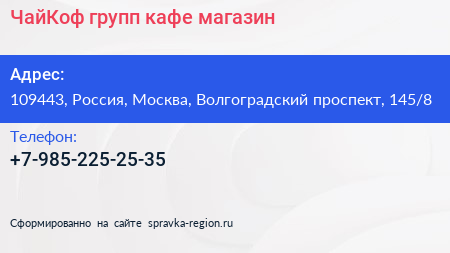 ЧайКоф групп, кафе-магазин по адресу 109443, Россия, Москва, Волгоградский проспект, 145/8 в дальнейшем Организация, размещена в следующих категориях: