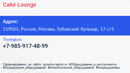 Cake Lounge по адресу 119021, Россия, Москва, Зубовский бульвар, 17 ст1 в дальнейшем Организация, размещена в следующих категориях: