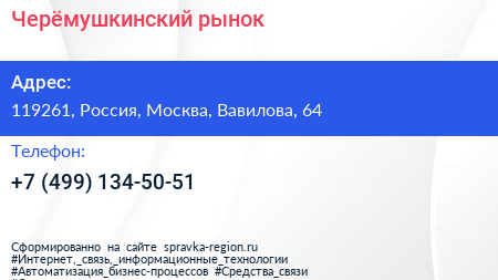 Черёмушкинский рынок по адресу 119261, Россия, Москва, Вавилова, 64 в дальнейшем Организация, размещена в следующих категориях: