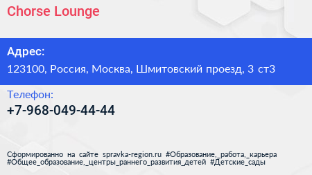 Chorse Lounge по адресу 123100, Россия, Москва, Шмитовский проезд, 3 ст3 в дальнейшем Организация, размещена в следующих категориях:
