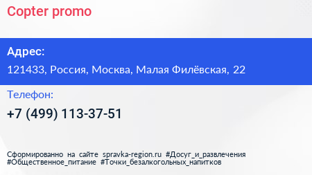 Copter.promo по адресу 121433, Россия, Москва, Малая Филёвская, 22 в дальнейшем Организация, размещена в следующих категориях: