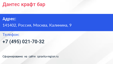 Дантес, крафт-бар по адресу 141402, Россия, Москва, Калинина, 9 в дальнейшем Организация, размещена в следующих категориях: