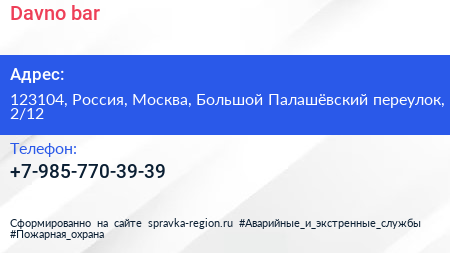 Davno bar по адресу 123104, Россия, Москва, Большой Палашёвский переулок, 2/12 в дальнейшем Организация, размещена в следующих категориях: