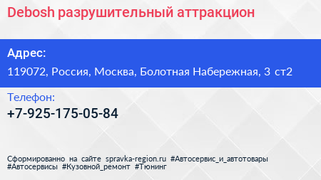 Debosh, разрушительный аттракцион по адресу 119072, Россия, Москва, Болотная Набережная, 3 ст2 в дальнейшем Организация, размещена в следующих категориях: