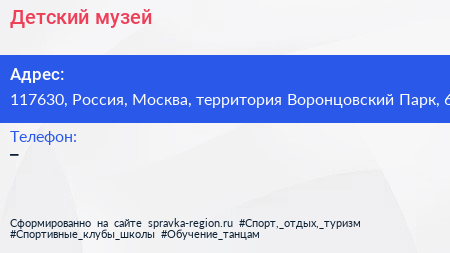 Детский музей по адресу 117630, Россия, Москва, территория Воронцовский Парк, 6 в дальнейшем Организация, размещена в следующих категориях:
