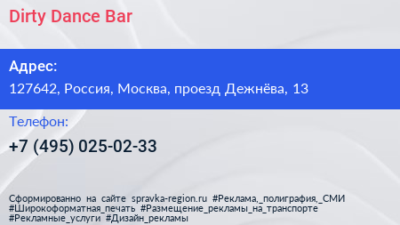 Dirty Dance Bar по адресу 127642, Россия, Москва, проезд Дежнёва, 13 в дальнейшем Организация, размещена в следующих категориях: