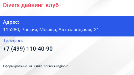 Divers, дайвинг-клуб по адресу 115280, Россия, Москва, Автозаводская, 21 в дальнейшем Организация, размещена в следующих категориях: