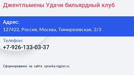 Джентльмены Удачи, бильярдный клуб по адресу 127422, Россия, Москва, Тимирязевская, 2/3 в дальнейшем Организация, размещена в следующих категориях: