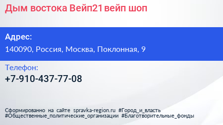 Дым востока & Вейп21, вейп-шоп по адресу 140090, Россия, Москва, Поклонная, 9 в дальнейшем Организация, размещена в следующих категориях: