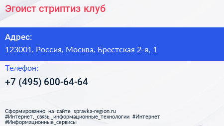 Эгоист, стриптиз-клуб по адресу 123001, Россия, Москва, Брестская 2-я, 1 в дальнейшем Организация, размещена в следующих категориях: