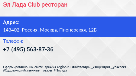 Эл`Лада Club, ресторан по адресу 143402, Россия, Москва, Пионерская, 12Б в дальнейшем Организация, размещена в следующих категориях: