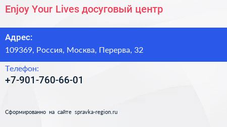 Enjoy Your Lives, досуговый центр по адресу 109369, Россия, Москва, Перерва, 32 в дальнейшем Организация, размещена в следующих категориях: