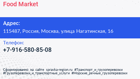 Food Market по адресу 115487, Россия, Москва, улица Нагатинская, 16 в дальнейшем Организация, размещена в следующих категориях: