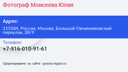 Фотограф Моисеева Юлия по адресу 115184, Россия, Москва, Большой Овчинниковский переулок, 28/9 в дальнейшем Организация, размещена в следующих категориях: